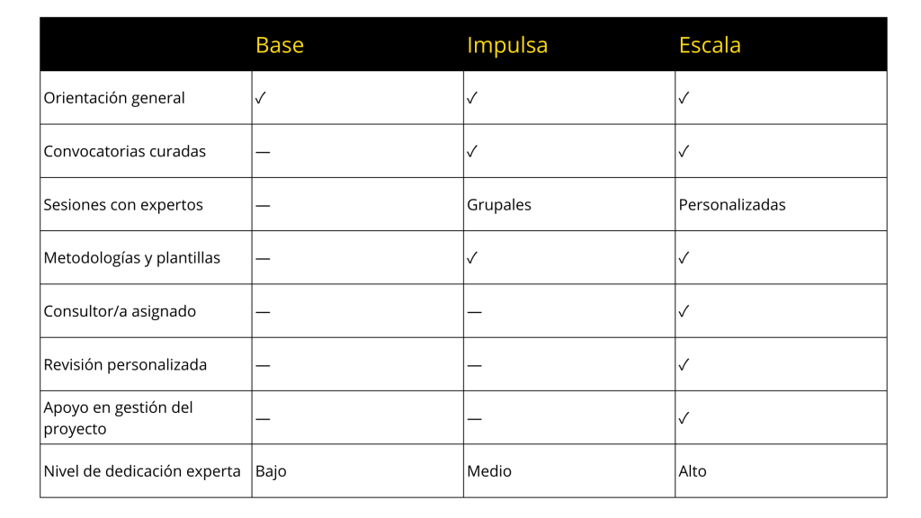 Por eso, PROYECTA estructura su trabajo en tres niveles de acompañamiento, que reflejan distintos grados de dedicación, acceso a personas expertas y apoyo en la gestión.
